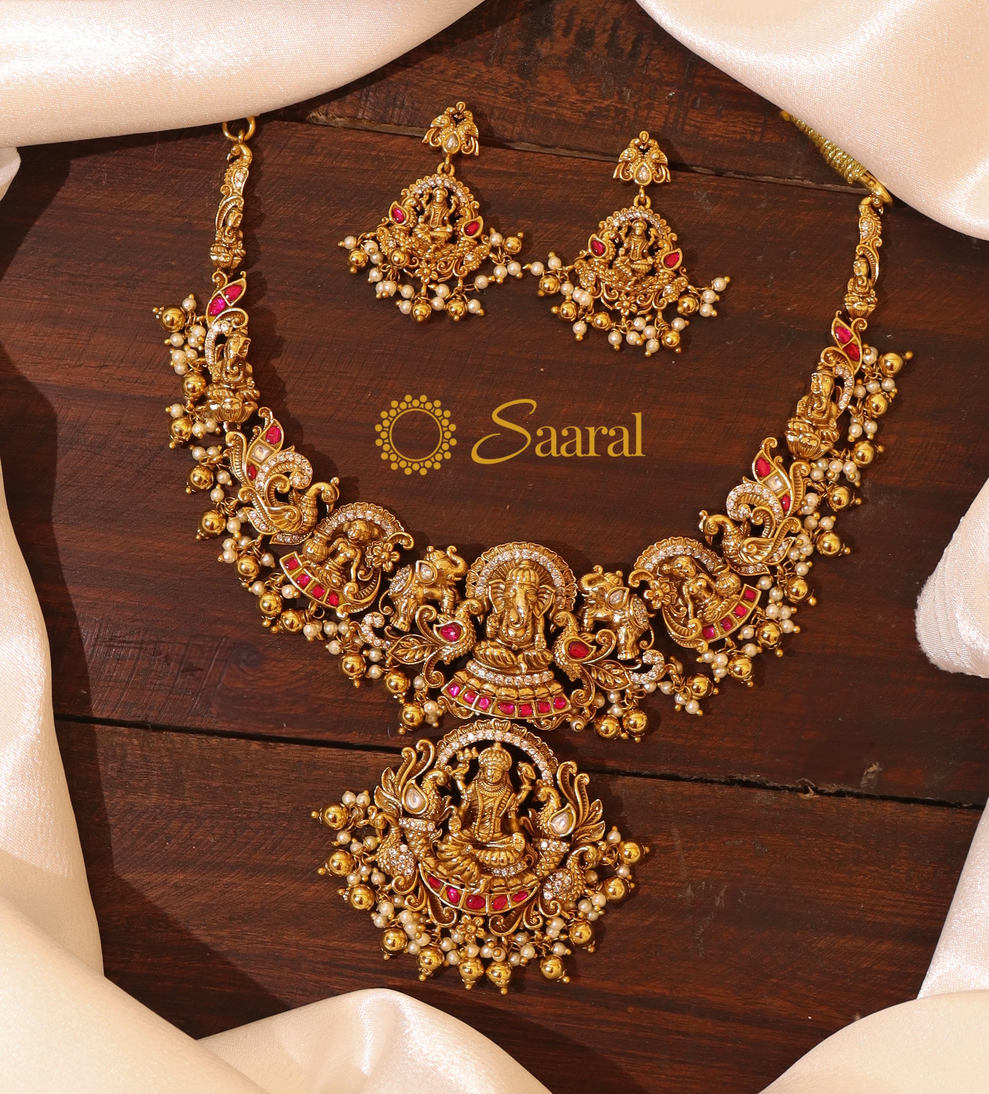 This Antique Temple Jewelry Set features exquisitely detailed Ganesh and Lakshmi motifs, embodying traditional artistry. Its intricate design makes it an ideal choice for temple ceremonies and weddings, adding a touch of sacred elegance to your ensemble. Crafted to highlight cultural heritage, this set enhances your look with timeless charm and spiritual significance.