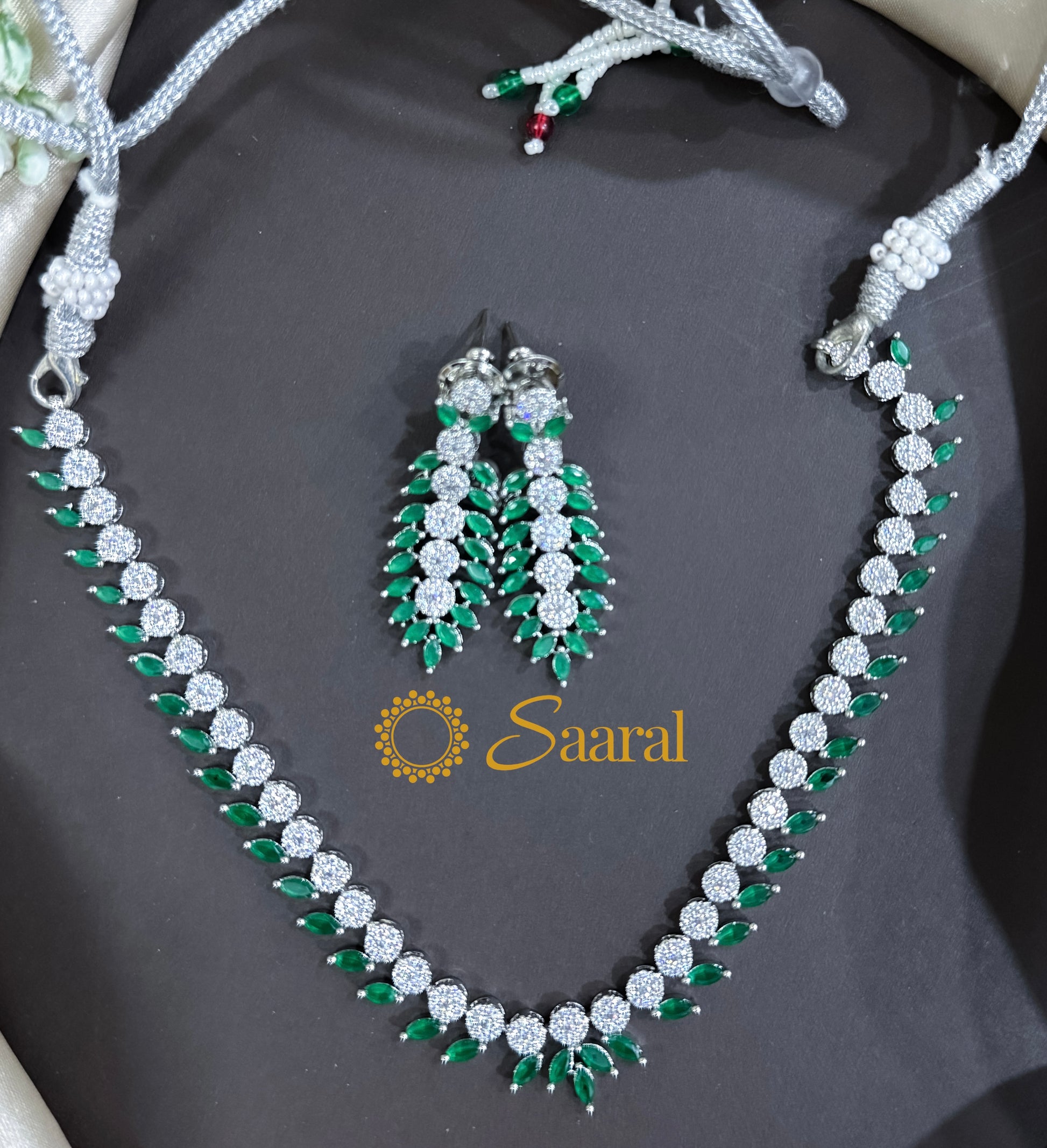 This exquisite leaf-pattern silver neckset features a striking green stone set on a polished silver base. Its intricate design combines natural elegance with expert craftsmanship, making it a perfect accessory to enhance any outfit. Paired with matching stunning earrings, this set offers a harmonious blend of style and sophistication.